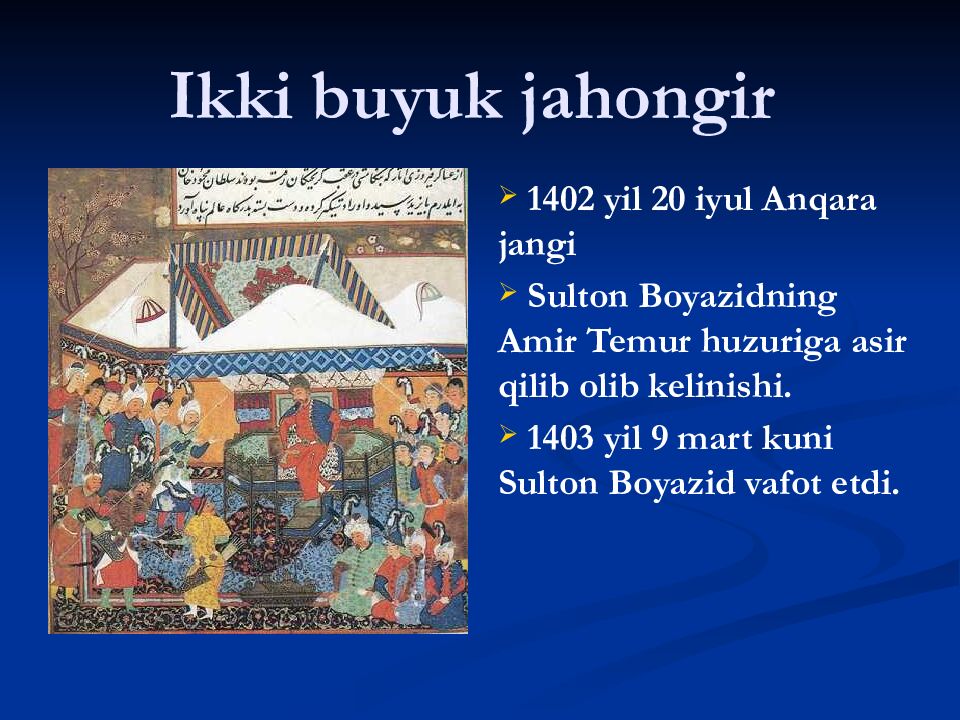 1402 yil 20 iyul Anqara jangi Sulton Boyazidning Amir Temur huzuriga asir qilib olib kelinishi. 1403 yil 9 mart kuni Sulton Boyazid vafot etdi.