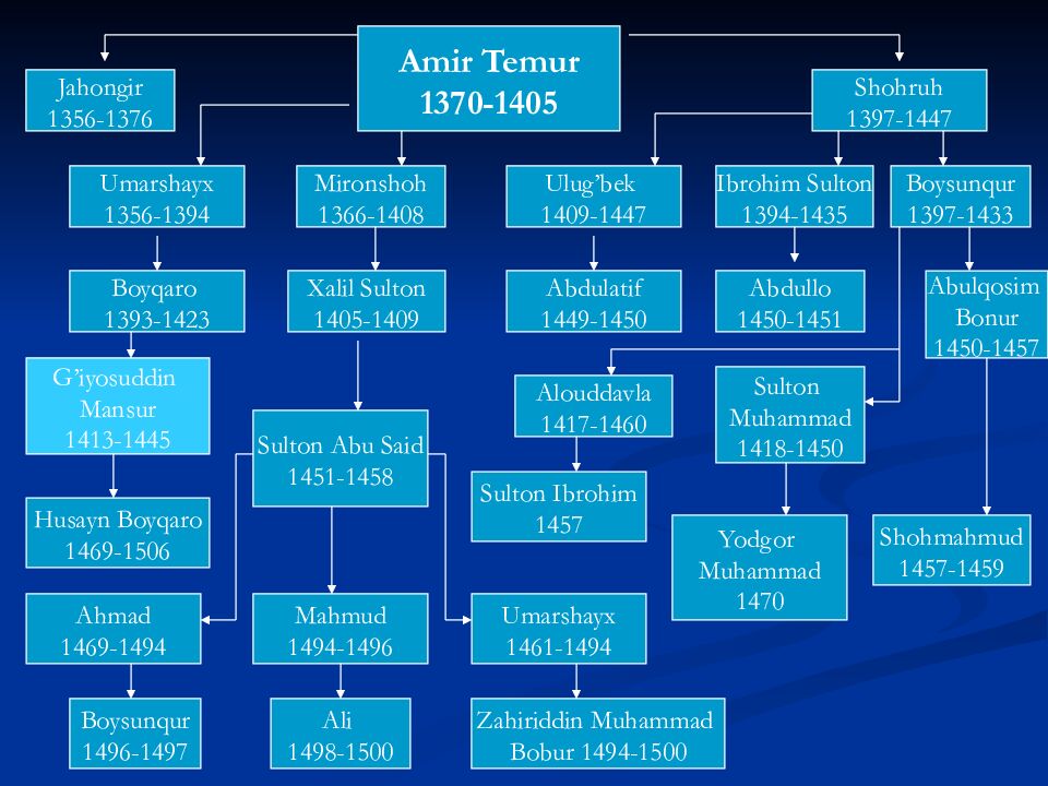 Jahongir 1356-1376 Shohruh 1397-1447 Ibrohim Sulton 1394-1435 Umarshayx 1356-1394 Mironshoh 1366-1408 Ulug’bek 1409-1447 Boysunqur 1397-1433 Amir Temur 1370-1405 Boyqaro 1393-1423 Xalil Sulton 1405-1409 Abdulatif 1449-1450 Abdullo 1450-1451 G’iyosuddin Mansur 1413-1445 Sulton Abu Said 1451-1458 Alouddavla 1417-1460 Sulton Muhammad 1418-1450 Abulqosim Bonur 1450-1457 Husayn Boyqaro 1469-1506 Shohmahmud 1457-1459 Yodgor Muhammad 1470 Sulton Ibrohim 1457 Umarshayx 1461-1494 Mahmud 1494-1496 Ahmad 1469-1494 Boysunqur 1496-1497 Ali 1498-1500 Zahiriddin Muhammad Bobur 1494-1500