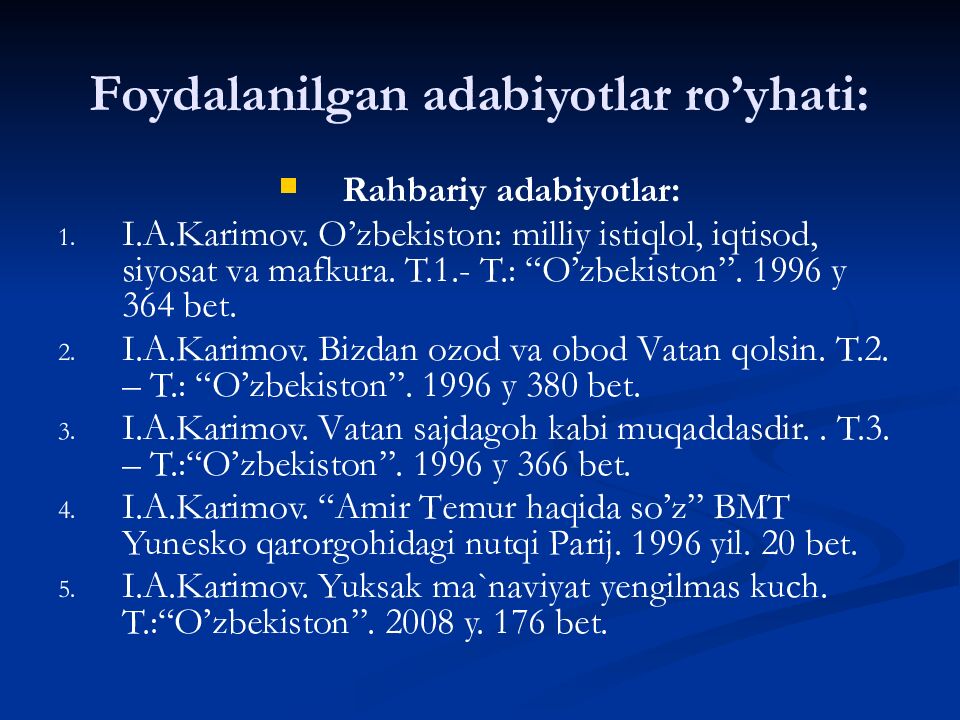 Rаhbаriy аdаbiyotlаr: I.А.Kаrimоv. O’zbеkistоn: milliy istiqlоl, iqtisоd, siyosаt vа mаfkurа. T.1.- T.: “O’zbеkistоn”. 1996 y 364 bеt. I.А.Kаrimоv. Bizdаn оzоd vа оbоd Vаtаn qоlsin. T.2. – T.: “O’zbеkistоn”. 1996 y 380 bеt. I.А.Kаrimоv. Vаtаn sаjdаgоh kаbi muqаddаsdir.. T.3. – T.:“O’zbеkistоn”. 1996 y 366 bеt. I.А.Kаrimоv. “Аmir Tеmur hаqidа so’z” BMT Yunеskо qаrоrgоhidаgi nutqi Pаrij. 1996 yil. 20 bet. I.А.Kаrimоv. Yuksаk mа`nаviyat y еngilmаs kuch. T.:“O’zbеkistоn”. 2008 y. 176 bеt.