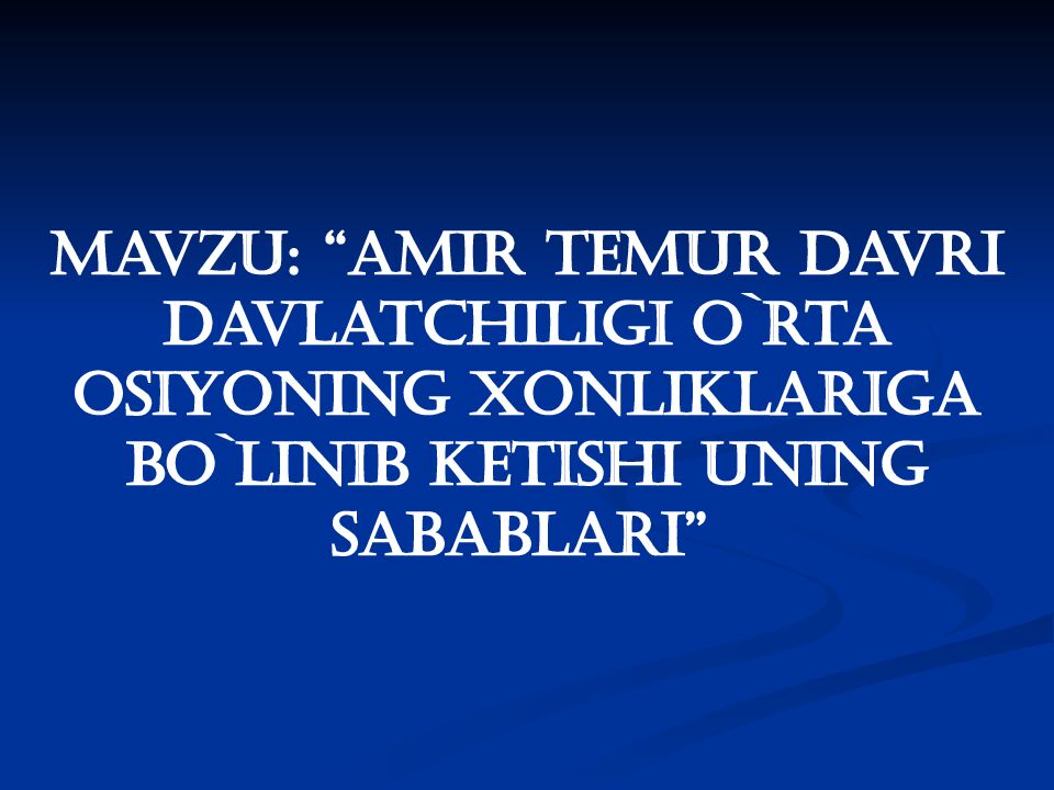 Первый слайд презентации: MAVZU : “AMIR TEMUR davri davlatchiligi o`rta osiyoning xonliklariga bo`linib ketishi uning sabablari ”