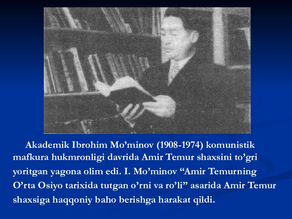 Akademik Ibrohim Mo’minov (1908-1974) komunistik mafkura hukmronligi davrida Amir Temur shaxsini to’gri yoritgan yagona olim edi. I. Mo’minov “Amir Temurning O’rta Osiyo tarixida tutgan o’rni va ro’li” asarida Amir Temur shaxsiga haqqoniy baho berishga harakat qildi.