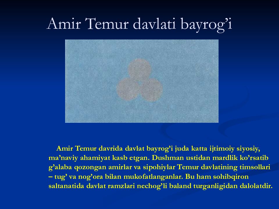 Amir Temur davrida davlat bayrog’i juda katta ijtimoiy siyosiy, ma’naviy ahamiyat kasb etgan. Dushman ustidan mardlik ko’rsatib g’alaba qozongan amirlar va sipohiylar Temur davlatining timsollari – tug’ va nog’ora bilan mukofatlanganlar. Bu ham sohibqiron saltanatida davlat ramzlari nechog’li baland turganligidan dalolatdir.