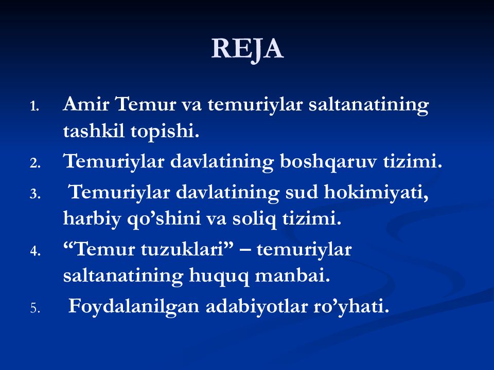 Amir Temur va temuriylar saltanatining tashkil topishi. Temuriylar davlatining boshqaruv tizimi. Temuriylar davlatining sud hokimiyati, harbiy qo’shini va soliq tizimi. “Temur tuzuklari” – temuriylar saltanatining huquq manbai. Foydalanilgan adabiyotlar ro’yhati.