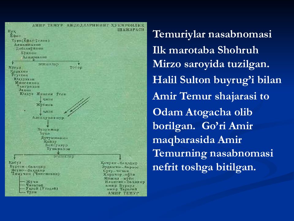 Temuriylar nasabnomasi Ilk marotaba Shohruh Mirzo saroyida tuzilgan. Halil Sulton buyrug’i bilan Amir Temur shajarasi to Odam Atogacha olib borilgan. Go’ri Amir maqbarasida Amir Temurning nasabnomasi nefrit toshga bitilgan.