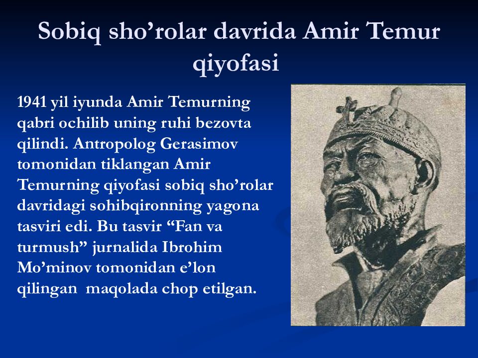 1941 yil iyunda Amir Temurning qabri ochilib uning ruhi bezovta qilindi. Antropolog Gerasimov tomonidan tiklangan Amir Temurning qiyofasi sobiq sho’rolar davridagi sohibqironning yagona tasviri edi. Bu tasvir “Fan va turmush” jurnalida Ibrohim Mo’minov tomonidan e’lon qilingan maqolada chop etilgan.