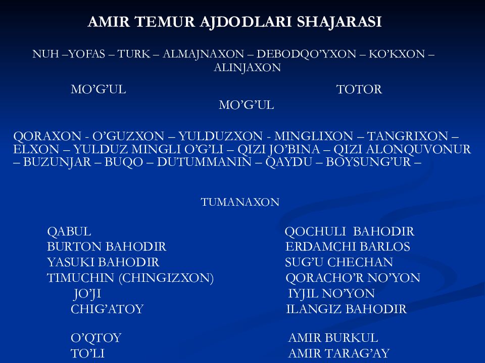 AMIR TEMUR AJDODLARI SHAJARASI NUH –YOFAS – TURK – ALMAJNAXON – DEBODQO’YXON – KO’KXON – ALINJAXON MO’G’UL TOTOR MO’G’UL QORAXON - O’GUZXON – YULDUZXON - MINGLIXON – TANGRIXON – ELXON – YULDUZ MINGLI O’G’LI – QIZI JO’BINA – QIZI ALONQUVONUR – BUZUNJAR – BUQO – DUTUMMANIN – QAYDU – BOYSUNG’UR – TUMANAXON QABUL QOCHULI BAHODIR BURTON BAHODIR ERDAMCHI BARLOS YASUKI BAHODIR SUG’U CHECHAN TIMUCHIN (CHINGIZXON) QORACHO’R NO’YON JO’JI IYJIL NO’YON CHIG’ATOY ILANGIZ BAHODIR O’QTOY AMIR BURKUL TO’LI AMIR TARAG’AY AMIR TEMUR