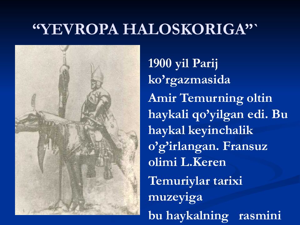 1900 yil Parij ko’rgazmasida Amir Temurning oltin haykali qo’yilgan edi. Bu haykal keyinchalik o’g’irlangan. Fransuz olimi L.Keren Temuriylar tarixi muzeyiga bu haykalning rasmini sovg’a qilgan.