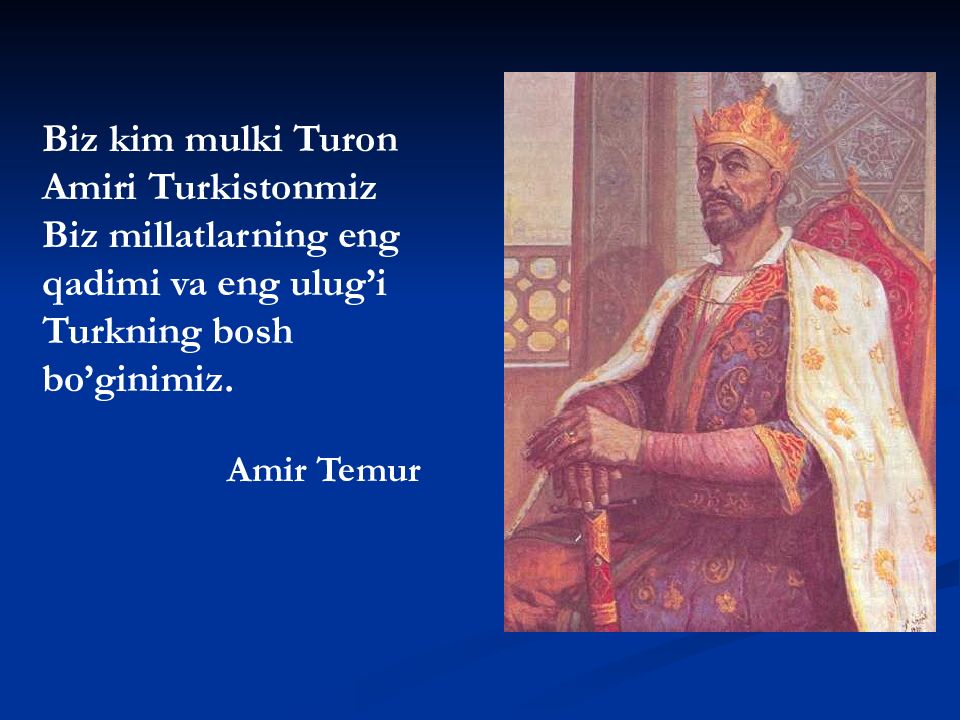 Последний слайд презентации: MAVZU : “AMIR TEMUR davri davlatchiligi o`rta osiyoning xonliklariga bo`linib: Sobiq sho’rolar davrida Amir Temur qiyofasi