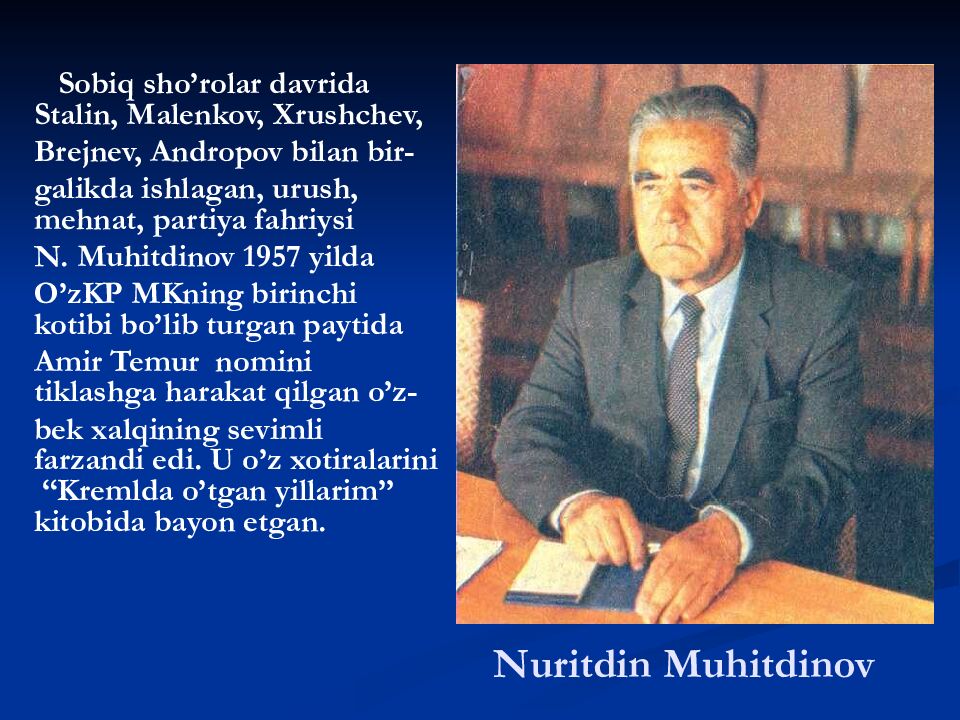 Sobiq sho’rolar davrida Stalin, Malenkov, Xrushchev, Brejnev, Andropov bilan bir- galikda ishlagan, urush, mehnat, partiya fahriysi N. Muhitdinov 1957 yilda O’zKP MKning birinchi kotibi bo’lib turgan paytida Amir Temur nomini tiklashga harakat qilgan o’z- bek xalqining sevimli farzandi edi. U o’z xotiralarini “Kremlda o’tgan yillarim” kitobida bayon etgan. Nuritdin Muhitdinov