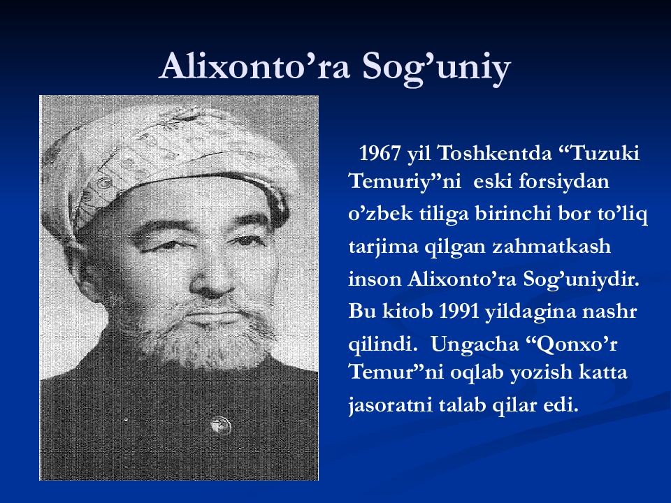 1967 yil Toshkentda “Tuzuki Temuriy”ni eski forsiydan o’zbek tiliga birinchi bor to’liq tarjima qilgan zahmatkash inson Alixonto’ra Sog’uniydir. Bu kitob 1991 yildagina nashr qilindi. Ungacha “Qonxo’r Temur”ni oqlab yozish katta jasoratni talab qilar edi.