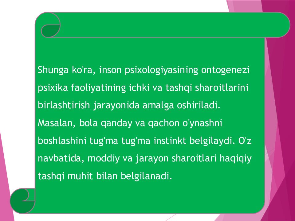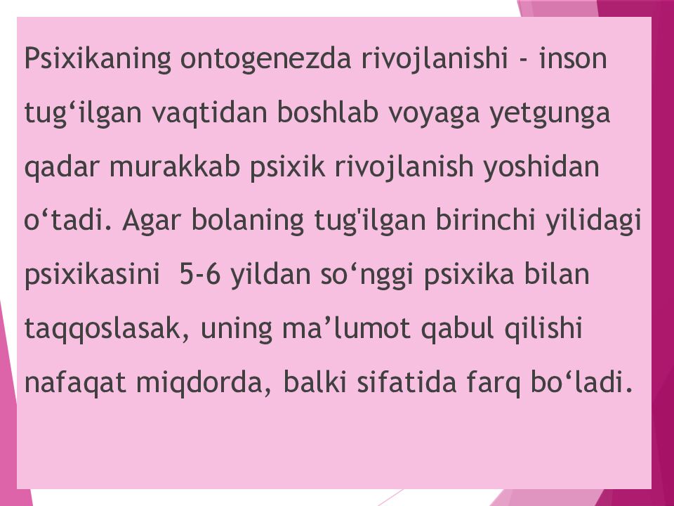 Первый слайд презентации: Mavzu : Inson psixikasining ontogenezda rivojlanishi