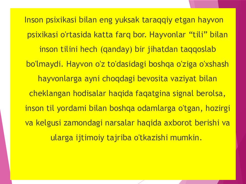 Inson psixikasi bilan eng yuksak taraqqiy etgan hayvon psixikasi o'rtasida katta farq bor. Hayvonlar “ tili ” bilan inson tilini hech ( qanday ) bir jihatdan taqqoslab bo'lmaydi. Hayvon o'z to'dasidagi boshqa o'ziga o'xshash hayvonlarga ayni choqdagi bevosita vaziyat bilan cheklangan hodisalar haqida faqatgina signal berolsa, inson til yordami bilan boshqa odamlarga o'tgan, hozirgi va kelgusi zamondagi narsalar haqida axborot berishi va ularga ijtimoiy tajriba o'tkazishi mumkin.