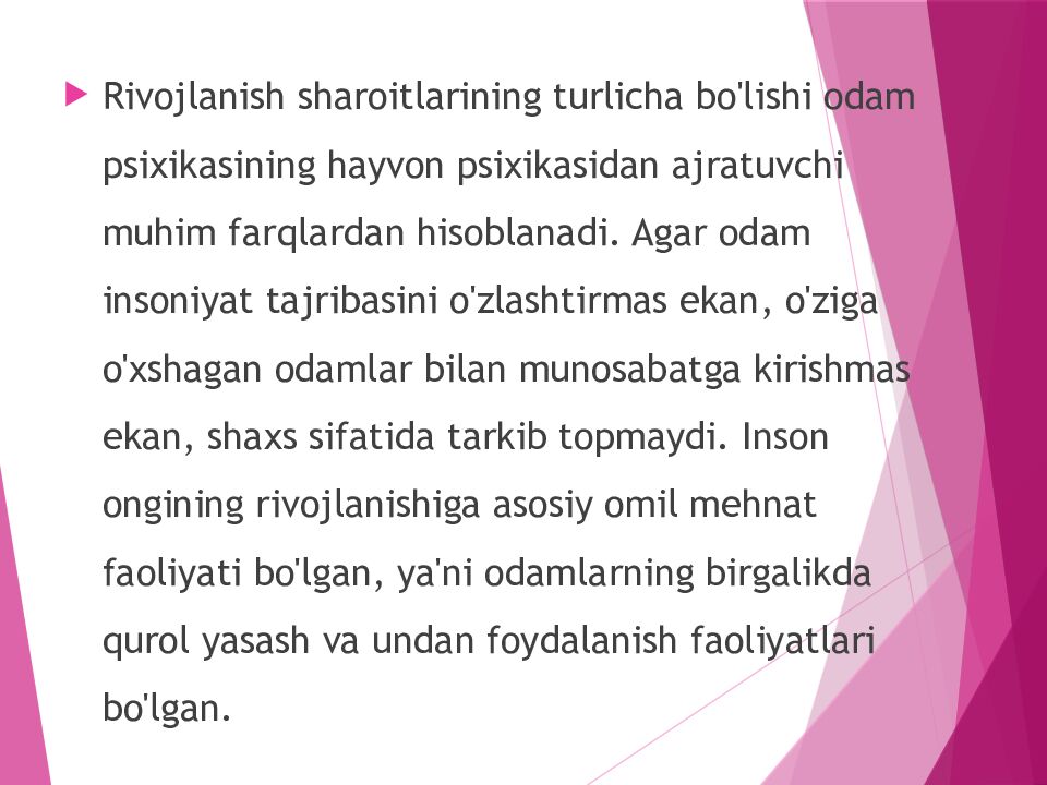 Rivojlanish sharoitlarining turlicha bo'lishi odam psixikasining hayvon psixikasidan ajratuvchi muhim farqlardan hisoblanadi. Agar odam insoniyat tajribasini o'zlashtirmas ekan, o'ziga o'xshagan odamlar bilan munosabatga kirishmas ekan, shaxs sifatida tarkib topmaydi. Inson ongining rivojlanishiga asosiy omil mehnat faoliyati bo'lgan, ya'ni odamlarning birgalikda qurol yasash va undan foydalanish faoliyatlari bo'lgan.