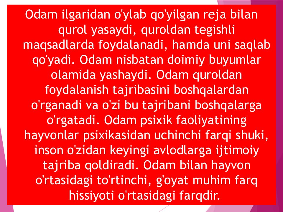 Odam ilgaridan o'ylab qo'yilgan reja bilan qurol yasaydi, quroldan tegishli maqsadlarda foydalanadi, hamda uni saqlab qo'yadi. Odam nisbatan doimiy buyumlar olamida yashaydi. Odam quroldan foydalanish tajribasini boshqalardan o'rganadi va o'zi bu tajribani boshqalarga o'rgatadi. Odam psixik faoliyatining hayvonlar psixikasidan uchinchi farqi shuki, inson o'zidan keyingi avlodlarga ijtimoiy tajriba qoldiradi. Odam bilan hayvon o'rtasidagi to'rtinchi, g'oyat muhim farq hissiyoti o'rtasidagi farqdir.