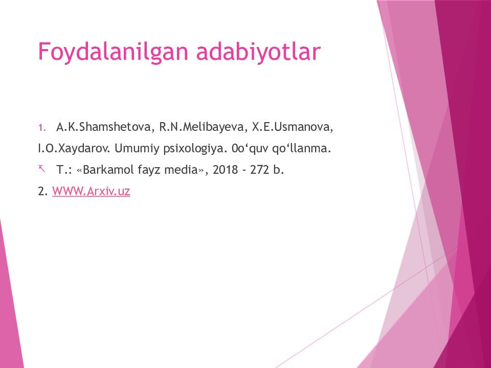 A.K.Shamshetova, R.N.Melibayeva, X.E.Usmanova, I.O.Xaydarov. Umumiy psixologiya. 0o‘quv qo‘llanma. Т.: « Barkamol fayz media», 2018 - 272 b. 2. WWW.Arxiv.uz