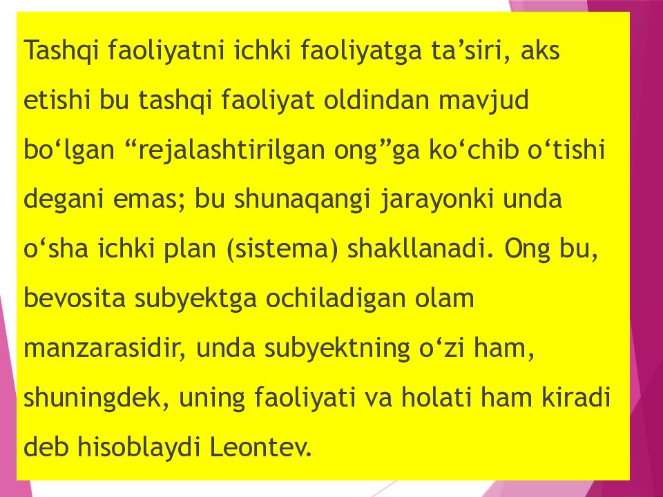 Tashqi faoliyatni ichki faoliyatga ta’siri, aks etishi bu tashqi faoliyat oldindan mavjud bo‘lgan “rejalashtirilgan ong”ga ko‘chib o‘tishi degani emas; bu shunaqangi jarayonki unda o‘sha ichki plan (sistema) shakllanadi. Ong bu, bevosita subyektga ochiladigan olam manzarasidir, unda subyektning o‘zi ham, shuningdek, uning faoliyati va holati ham kiradi deb hisoblaydi Leontev.