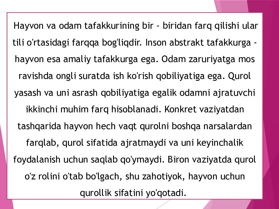 Hayvon va odam tafakkurining bir - biridan farq qilishi ular tili o'rtasidagi farqqa bog'liqdir. Inson abstrakt tafakkurga - hayvon esa amaliy tafakkurga ega. Odam zaruriyatga mos ravishda ongli suratda ish ko'rish qobiliyatiga ega. Qurol yasash va uni asrash qobiliyatiga egalik odamni ajratuvchi ikkinchi muhim farq hisoblanadi. Konkret vaziyatdan tashqarida hayvon hech vaqt qurolni boshqa narsalardan farqlab, qurol sifatida ajratmaydi va uni keyinchalik foydalanish uchun saqlab qo'ymaydi. Biron vaziyatda qurol o'z rolini o'tab bo'lgach, shu zahotiyok, hayvon uchun qurollik sifatini yo'qotadi.