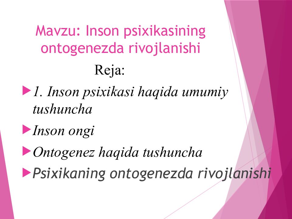 Reja : 1. Inson psixikasi haqida umumiy tushuncha Inson ongi Ontogenez haqida tushuncha Psixikaning ontogenezda rivojlanishi