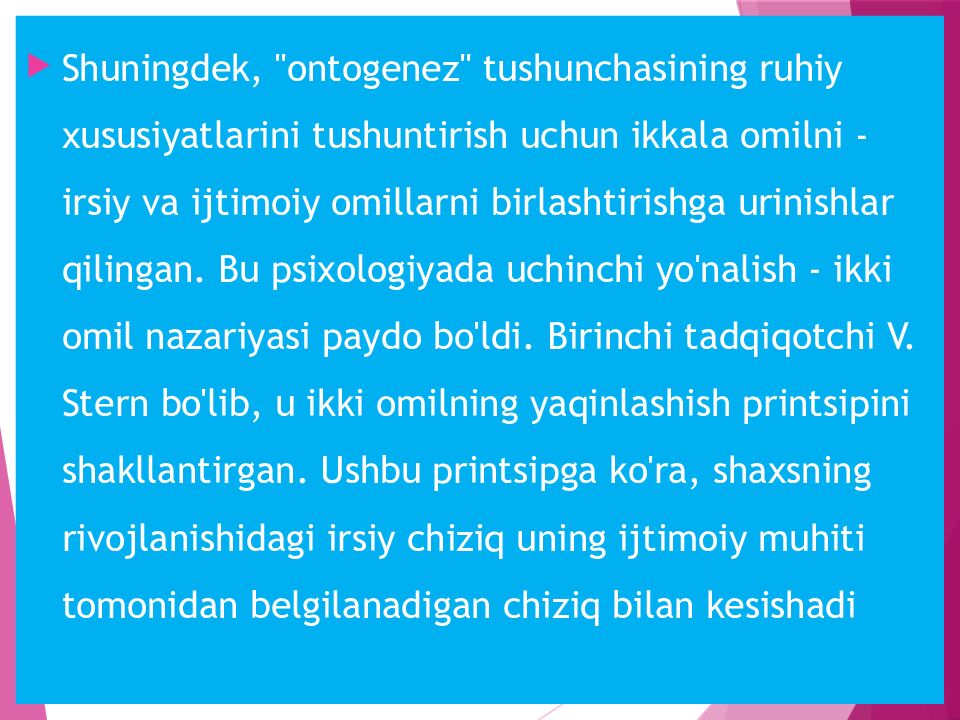 Shuningdek, "ontogenez" tushunchasining ruhiy xususiyatlarini tushuntirish uchun ikkala omilni - irsiy va ijtimoiy omillarni birlashtirishga urinishlar qilingan. Bu psixologiyada uchinchi yo'nalish - ikki omil nazariyasi paydo bo'ldi. Birinchi tadqiqotchi V. Stern bo'lib, u ikki omilning yaqinlashish printsipini shakllantirgan. Ushbu printsipga ko'ra, shaxsning rivojlanishidagi irsiy chiziq uning ijtimoiy muhiti tomonidan belgilanadigan chiziq bilan kesishadi