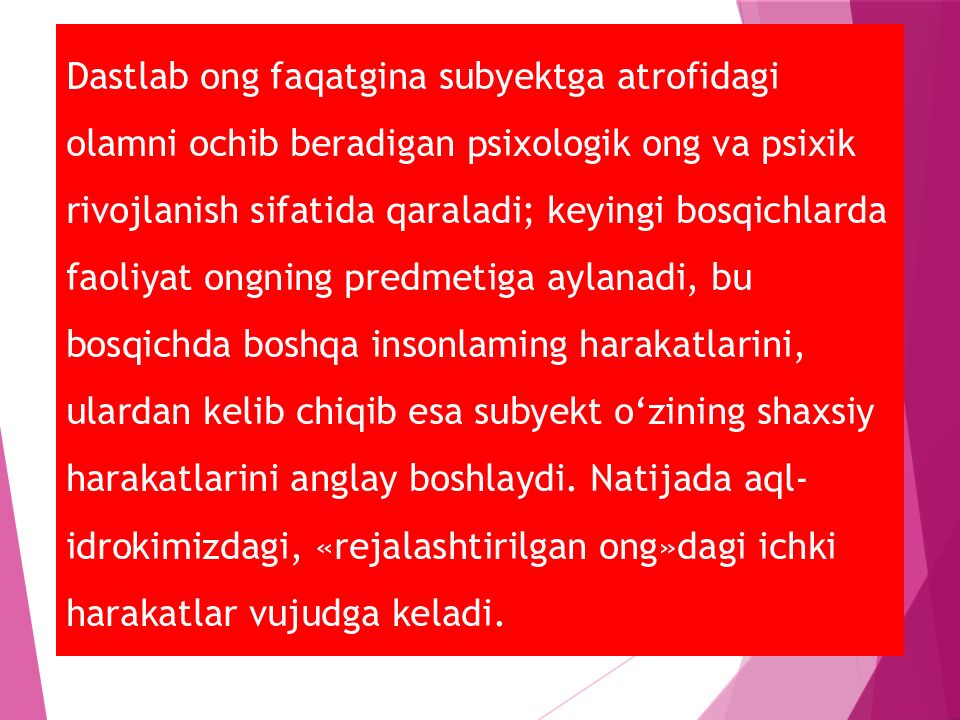 Dastlab ong faqatgina subyektga atrofidagi olamni ochib beradigan psixologik ong va psixik rivojlanish sifatida qaraladi; keyingi bosqichlarda faoliyat ongning predmetiga aylanadi, bu bosqichda boshqa insonlaming harakatlarini, ulardan kelib chiqib esa subyekt o‘zining shaxsiy harakatlarini anglay boshlaydi. Natijada aql-idrokimizdagi, «rejalashtirilgan ong»dagi ichki harakatlar vujudga keladi.