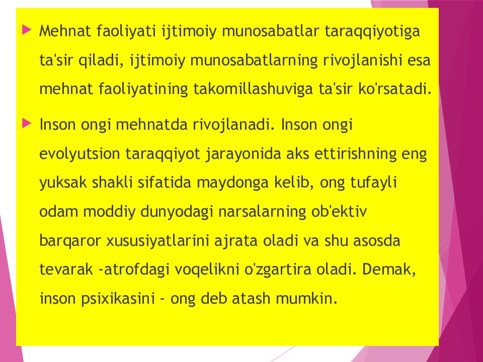 Mehnat faoliyati ijtimoiy munosabatlar taraqqiyotiga ta'sir qiladi, ijtimoiy munosabatlarning rivojlanishi esa mehnat faoliyatining takomillashuviga ta'sir ko'rsatadi. Inson ongi mehnatda rivojlanadi. Inson ongi evolyutsion taraqqiyot jarayonida aks ettirishning eng yuksak shakli sifatida maydonga kelib, ong tufayli odam moddiy dunyodagi narsalarning ob'ektiv barqaror xususiyatlarini ajrata oladi va shu asosda tevarak - atrofdagi voqelikni o'zgartira oladi. Demak, inson psixikasini - ong deb atash mumkin.