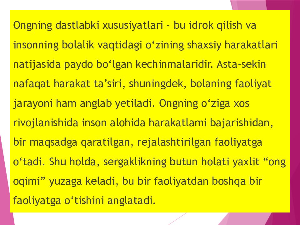 Ongning dastlabki xususiyatlari - bu idrok qilish va insonning bolalik vaqtidagi o‘zining shaxsiy harakatlari natijasida paydo bo‘lgan kechinmalaridir. Asta-sekin nafaqat harakat ta’siri, shuningdek, bolaning faoliyat jarayoni ham anglab yetiladi. Ongning o‘ziga xos rivojlanishida inson alohida harakatlami bajarishidan, bir maqsadga qaratilgan, rejalashtirilgan faoliyatga o‘tadi. Shu holda, sergaklikning butun holati yaxlit “ong oqimi” yuzaga keladi, bu bir faoliyatdan boshqa bir faoliyatga o‘tishini anglatadi.