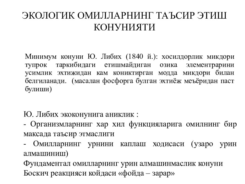 Минимум конуни Ю. Либих (1840 й.): хосилдорлик микдори тупрок таркибидаги етишмайдиган озика элементрарини усимлик эхтижидан кам кониктирган модда микдори билан белгиланади. (масалан фосфорга булган эхтиёж меъёридан паст булиши) Ю. Либих экоконунига аниклик : - Организмларнинг хар хил функцияларига омилнинг бир максада таъсир этмаслиги - Омилларнинг урнини каплаш ходисаси (узаро урин алмашиниш) Фундаментал омилларнинг урин алмашинмаслик конуни Боскич реакцияси койдаси «фойда – зарар»