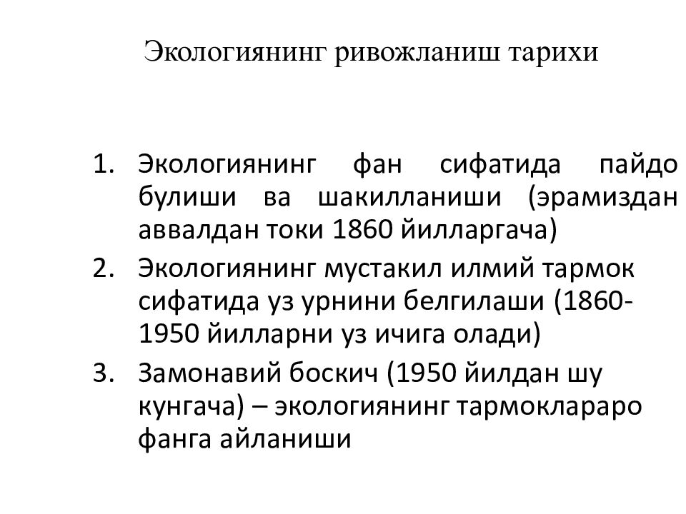 Экологиянинг фан сифатида пайдо булиши ва шакилланиши (эрамиздан аввалдан токи 1860 йилларгача) Экологиянинг мустакил илмий тармок сифатида уз урнини белгилаши (1860-1950 йилларни уз ичига олади) Замонавий боскич (1950 йилдан шу кунгача) – экологиянинг тармоклараро фанга айланиши