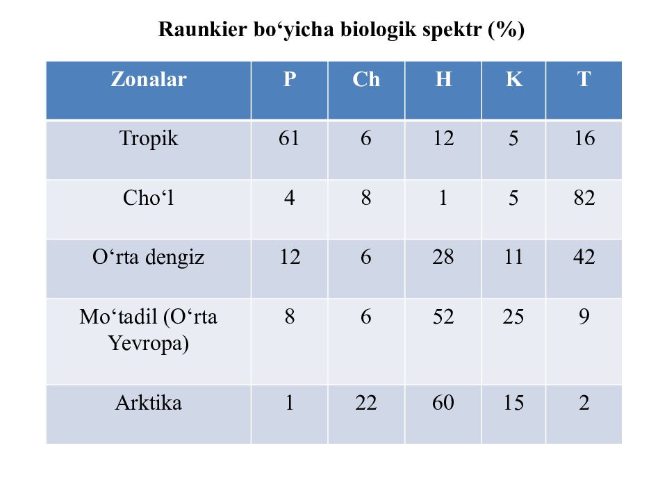 Zonalar P Ch H K T Tropik 61 6 12 5 16 Cho‘l 4 8 1 5 82 O‘rta dengiz 12 6 28 11 42 Mo‘tadil (O‘rta Yevropa) 8 6 52 25 9 Arktika 1 22 60 15 2 Raunkier bo‘yicha biologik spektr (%)