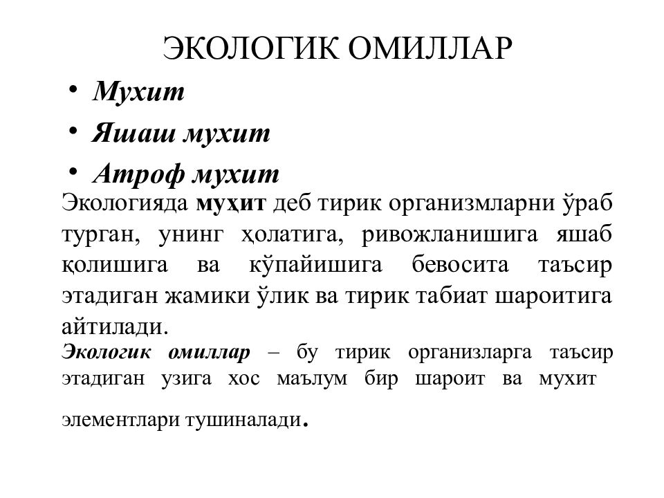 Мухит Яшаш мухит Атроф мухит Экологик омиллар – бу тирик организларга таъсир этадиган узига хос маълум бир шароит ва мухит элементлари тушиналади. Экологияда муҳит деб тирик организмларни ўраб турган, унинг ҳолатига, ривожланишига яшаб қолишига ва кўпайишига бевосита таъсир этадиган жамики ўлик ва тирик табиат шароитига айтилади.