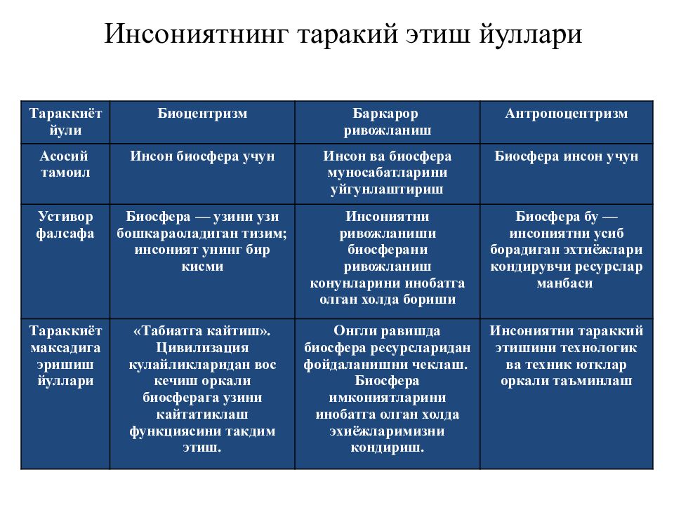 Тараккиёт йули Биоцентризм Баркарор ривожланиш Антропоцентризм Асосий тамоил Инсон биосфера учун Инсон ва биосфера муносабатларини уйгунлаштириш Биосфера инсон учун Устивор фалсафа Биосфера — узини узи бошкараоладиган тизим; инсоният унинг бир кисми Инсониятни ривожланиши биосферани ривожланиш конунларини инобатга олган холда бориши Биосфера бу — инсониятни усиб борадиган эхтиёжлари кондирувчи ресурслар манбаси Тараккиёт максадига эришиш йуллари «Табиатга кайтиш». Цивилизация кулайликларидан вос кечиш оркали биосферага узини кайтатиклаш функциясини такдим этиш. Онгли равишда биосфера ресурсларидан фойдаланишни чеклаш. Биосфера имкониятларини инобатга олган холда эхиёжларимизни кондириш. Инсониятни тараккий этишини технологик ва техник ютклар оркали таъминлаш