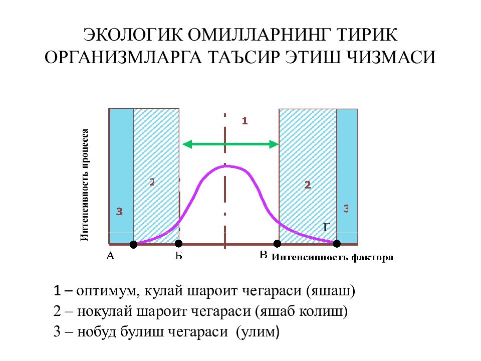 1 – оптимум, кулай шароит чегараси (яшаш) 2 – нокулай шароит чегараси (яшаб колиш) 3 – нобуд булиш чегараси (улим )