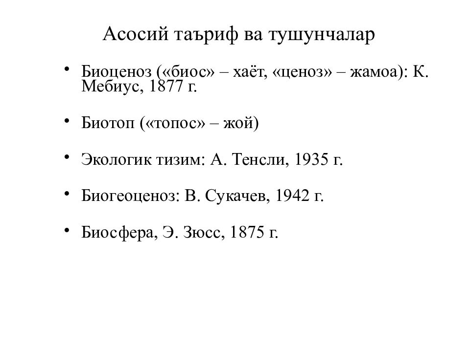 Биоценоз («биос» – хаёт, «ценоз» – жамоа): К. Мебиус, 1877 г. Биотоп («топос» – жой) Экологик тизим: А. Тенсли, 1935 г. Биогеоценоз: В. Сукачев, 194 2 г. Биосфера, Э. Зюсс, 1875 г.