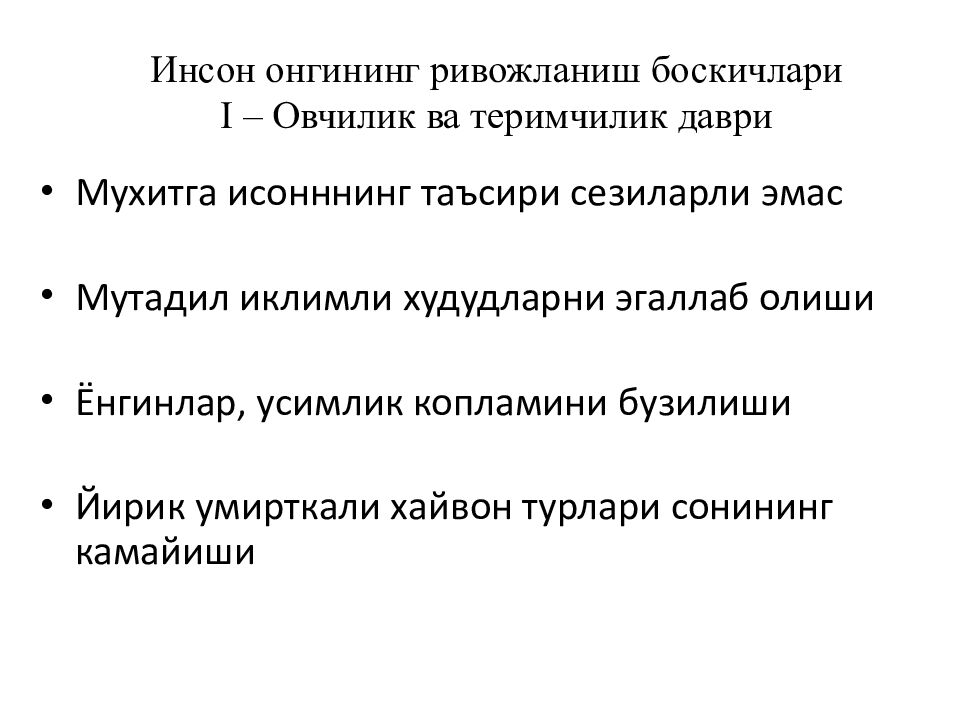 Слайд 10: Инсон онгининг ривожланиш боскичлари I – Овчилик ва теримчилик даври
