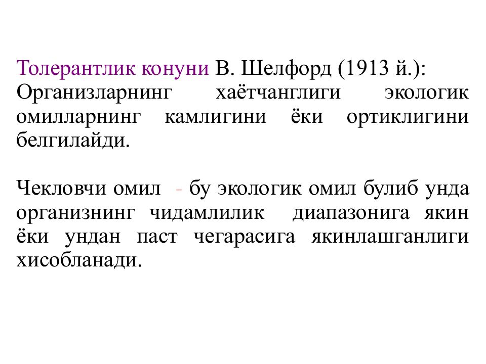Толерантлик конуни В. Шелфорд (1913 й.): Организларнинг хаётчанглиги экологик омилларнинг камлигини ёки ортиклигини белгилайди. Чекловчи омил - бу экологик омил булиб унда организнинг чидамлилик диапазонига якин ёки ундан паст чегарасига якинлашганлиги хисобланади.
