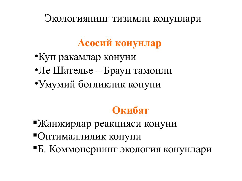 Асосий конунлар Куп ракамлар конуни Ле Шателье – Браун тамоили Умумий богликлик конуни Окибат Жанжирлар реакцияси конуни Оптималлилик конуни Б. Коммонернинг экология конунлари