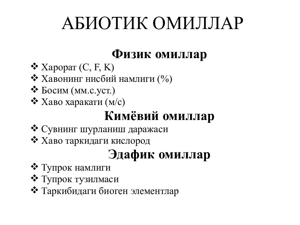 Физик омиллар Харорат (С, F, K ) Хавонинг нисбий намлиги (%) Босим (мм.с.уст.) Хаво харакати (м/с) Кимёвий омиллар Сувнинг шурланиш даражаси Хаво таркидаги кислород Эдафик омиллар Тупрок намлиги Тупрок тузилмаси Таркибидаги биоген элементлар