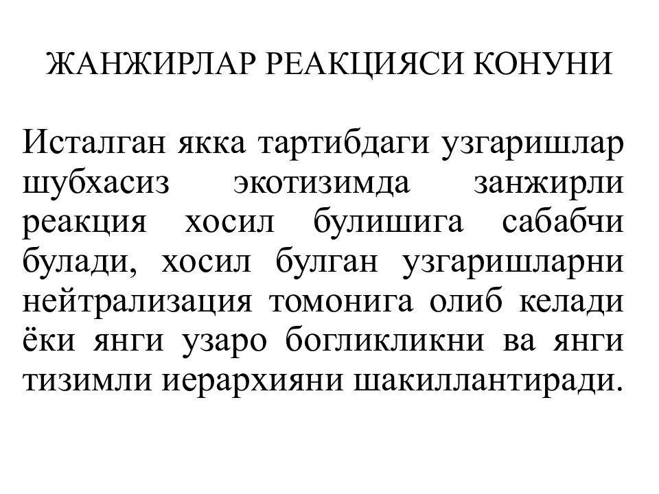 Исталган якка тартибдаги узгаришлар шубхасиз экотизимда занжирли реакция хосил булишига сабабчи булади, хосил булган узгаришларни нейтрализация томонига олиб келади ёки янги узаро богликликни ва янги тизимли иерархияни шакиллантиради.