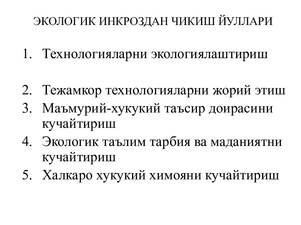 Слайд 21: ЭКОЛОГИК ИНКРОЗДАН ЧИКИШ ЙУЛЛАРИ