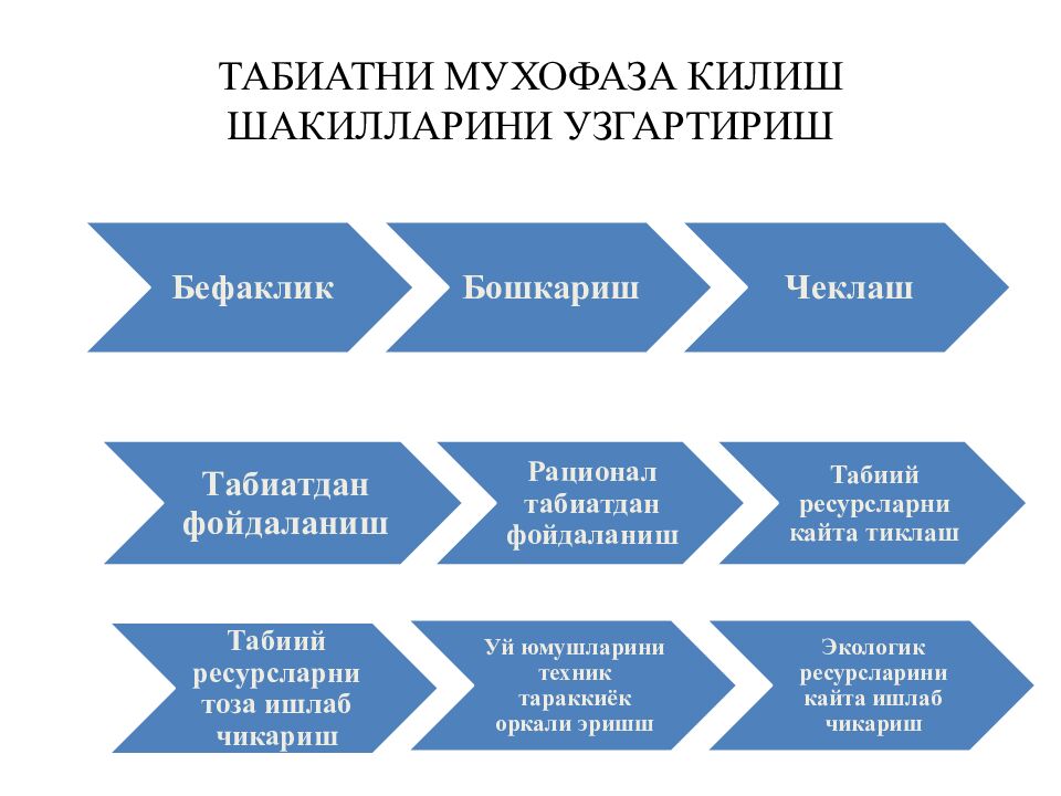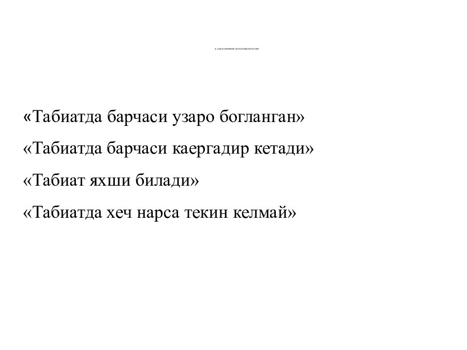 « Табиатда барчаси узаро богланган» «Табиатда барчаси каергадир кетади» «Табиат яхши билади» «Табиатда хеч нарса текин келмай»