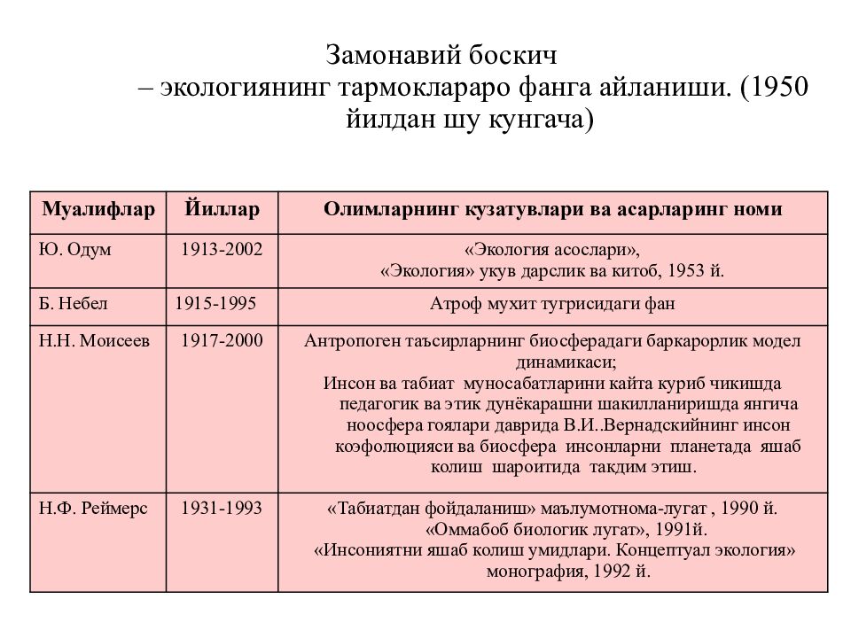 Муалифлар Йиллар Олимларнинг кузатувлари ва асарларинг номи Ю. Одум 1913-2002 «Экология асослари», «Экология» укув дарслик ва китоб, 1953 й. Б. Небел 1915-1995 Атроф мухит тугрисидаги фан Н.Н. Моисеев 1917-2000 Антропоген таъсирларнинг биосферадаги баркарорлик модел динамикаси; Инсон ва табиат муносабатларини кайта куриб чикишда педагогик ва этик дунёкарашни шакилланиришда янгича ноосфера гоялари даврида В.И..Вернадскийнинг инсон коэфолюцияси ва биосфера инсонларни планетада яшаб колиш шароитида такдим этиш. Н.Ф. Реймерс 1931-1993 «Табиатдан фойдаланиш» маълумотнома-лугат, 1990 й. «Оммабоб биологик лугат», 1991й. «Инсониятни яшаб колиш умидлари. Концептуал экология» монография, 1992 й.