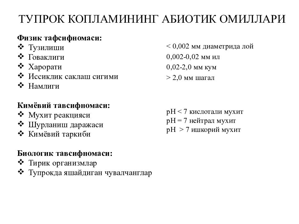 Физик тафсифномаси: Тузилиши Говаклиги Харорати Иссиклик саклаш сигими Намлиги Кимёвий тавсифномаси: Мухит реакцияси Шурланиш даражаси Кимёвий таркиби Биологик тавсифномаси: Тирик организмлар Тупрокда яшайдиган чувалчанглар < 0,002 мм диаметрида лой 0,002-0,02 мм ил 0,02-2,0 мм кум > 2,0 мм шагал рН < 7 кислотали мухит рН = 7 нейтрал мухит рН > 7 ишкорий мухит
