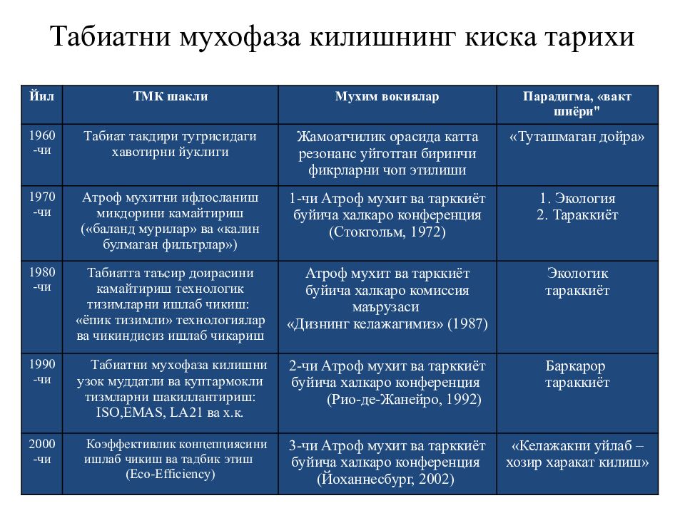 Йил ТМК шакли Мухим вокиялар Парадигма, «вакт шиёри" 1960-чи Табиат такдири тугрисидаги хавотирни йуклиги Жамоатчилик орасида катта резонанс уйготган биринчи фикрларни чоп этилиши «Туташмаган дойра» 1970-чи Атроф мухитни ифлосланиш микдорини камайтириш («баланд мурилар» ва «калин булмаган фильтрлар») 1-чи Атроф мухит ва тарккиёт буйича халкаро конференция (Стокгольм, 1972) 1. Экология 2. Тараккиёт 1980-чи Табиатга таъсир доирасини камайтириш технологик тизимларни ишлаб чикиш: «ёпик тизимли» технологиялар ва чикиндисиз ишлаб чикариш Атроф мухит ва тарккиёт буйича халкаро комиссия маърузаси «Дизнинг келажагимиз» (1987) Экологик тараккиёт 1990-чи Табиатни мухофаза килишни узок муддатли ва куптармокли тизмларни шакиллантириш: ISO,ЕМ AS, LA 21 ва х.к. 2-чи Атроф мухит ва тарккиёт буйича халкаро конференция (Рио-де-Жанейро, 1992) Баркарор тараккиёт 2000-чи Коэффективлик концепциясини ишлаб чикиш ва тадбик этиш ( Eco - Efficiency ) 3-чи Атроф мухит ва тарккиёт буйича халкаро конференция (Йоханнесбург, 2002) «Келажакни уйлаб – хозир харакат килиш»