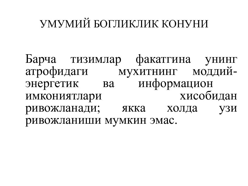 Слайд 28: УМУМИЙ БОГЛИКЛИК КОНУНИ