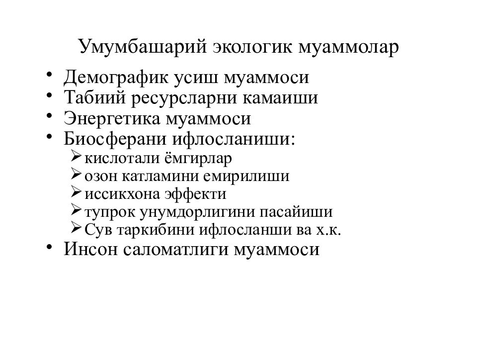 Демографик усиш муаммоси Табиий ресурсларни камаиши Энергетика муаммоси Биосферани ифлосланиши: кислотали ёмгирлар озон катламини емирилиши иссикхона эффекти тупрок унумдорлигини пасайиши Сув таркибини ифлосланши ва х.к. Инсон саломатлиги муаммоси