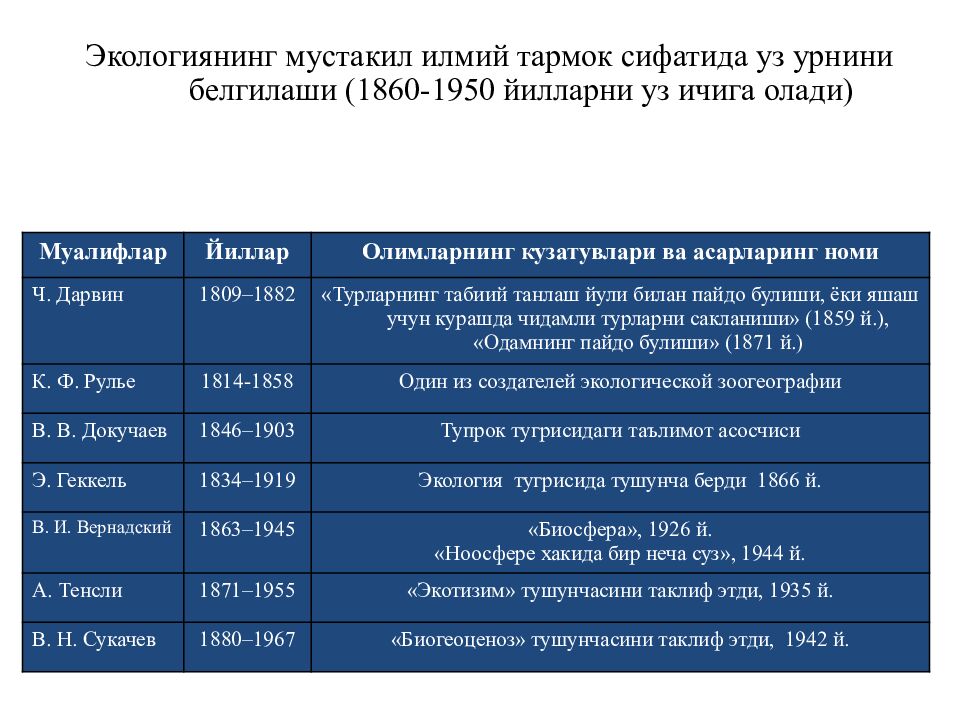 Муалифлар Йиллар Олимларнинг кузатувлари ва асарларинг номи Ч. Дарвин 1809–1882 «Турларнинг табиий танлаш йули билан пайдо булиши, ёки яшаш учун курашда чидамли турларни сакланиши» (1859 й.), «Одамнинг пайдо булиши» (1871 й.) К. Ф. Рулье 1814-1858 Один из создателей экологической зоогеографии В. В. Докучаев 1846–1903 Тупрок тугрисидаги таълимот асосчиси Э. Геккель 1834–1919 Экология тугрисида тушунча берди 1866 й. В. И. Вернадский 1863–1945 «Биосфера», 1926 й. «Ноосфере хакида бир неча суз», 1944 й. А. Тенсли 1871–1955 «Экотизим» тушунчасини таклиф этди, 1935 й. В. Н. Сукачев 1880–1967 «Биогеоценоз» тушунчасини таклиф этди, 1942 й.