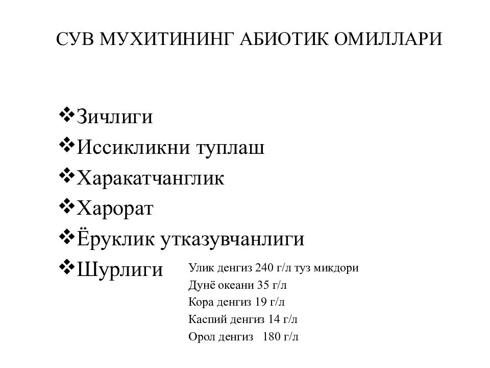 Слайд 38: СУВ МУХИТИНИНГ АБИОТИК ОМИЛЛАРИ