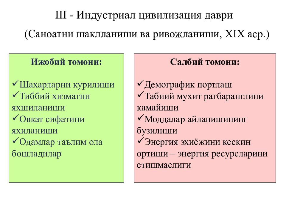 (Саноатни шаклланиши ва ривожланиши, ХIХ аср. ) Ижобий томони : Шахарларни курилиши Тиббий хизматни яхшиланиши Овкат сифатини яхиланиши Одамлар таълим ола бошладилар Салбий томони : Д емографи к портлаш Табиий мухит рагбаранглини камайиши Моддалар айланишининг бузилиши Энергия эхиёжини кескин ортиши – энергия ресурсларини етишмаслиги