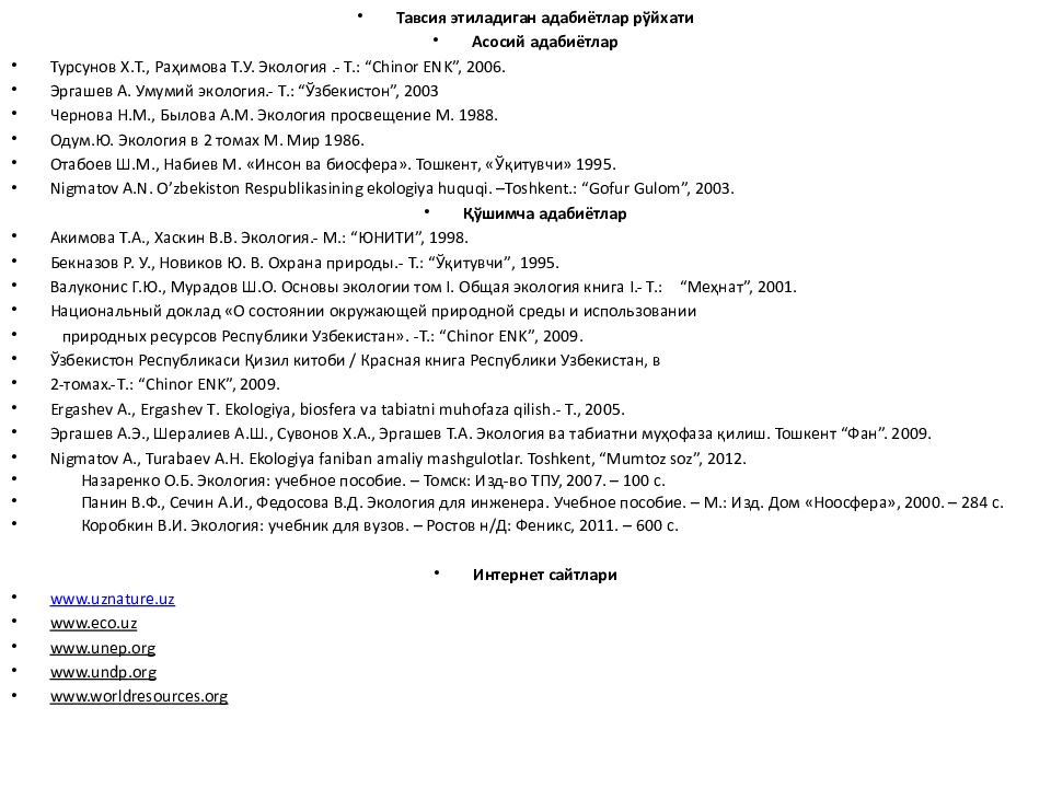Тавсия этиладиган адабиётлар рўйхати Асосий адабиётлар Турсунов Х.Т., Раҳимова Т.У. Экология.- Т.: “Chinor ENK”, 2006. Эргашев А. Умумий экология.- Т.: “Ўзбекистон”, 2003 Чернова Н.М., Былова А.М. Экология просвещение М. 1988. Одум.Ю. Экология в 2 томах М. Мир 1986. Отабоев Ш.М., Набиев М. « Инсон ва биосфера». Тошкент, « Ўқитувчи » 1995. Nigmatov A.N. O’zbekiston Respublikasining ekologiya huquqi. –Toshkent.: “Gofur Gulom”, 2003. Қўшимча адабиётлар Акимова Т.А., Хаскин В.В. Экология.- М.: “ЮНИТИ”, 1998. Бекназов Р. У., Новиков Ю. В. Охрана природы. - Т.: “ Ўқитувчи ”, 1995. Валуконис Г.Ю., Мурадов Ш.О. Основы экологии том I. Общая экология книга I.- Т.: “Меҳнат”, 2001. Национальный доклад «О состоянии окружающей природной среды и использовании природных ресурсов Республики Узбекистан». - Т.: “ Chinor ENK ”, 2009. Ўзбекистон Республикаси Қизил китоби / Красная книга Республики Узбекистан, в 2-томах.- Т.: “ Chinor ENK ”, 2009. Ergashev A., Ergashev T. Ekologiya, biosfera va tabiatni muhofaza qilish. - T., 2005. Эргашев А.Э., Шералиев А.Ш., Сувонов Х.А., Эргашев Т.А. Экология ва табиатни муҳофаза қилиш. Тошкент “Фан”. 2009. N igmatov A., Turabaev A.H. Ekologiya faniban amaliy mashgulotlar. Toshkent, “Mumtoz soz”, 2012. Назаренко О.Б. Экология: учебное пособие. – Томск: Изд-во ТПУ, 2007. – 100 с. Панин В.Ф., Сечин А.И., Федосова В.Д. Экология для инженера. Учебное пособие. – М.: Изд. Дом «Ноосфера», 2000. – 284 с. Коробкин В.И. Экология: учебник для вузов. – Ростов н /Д: Феникс, 2011. – 600 с. Интернет сайтлари www.uznature.uz www.есо.uz www.unep.org www.undp.org www.worldresources.org