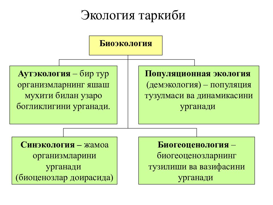 Биоэкология Аутэкология – бир тур организмларнинг яшаш мухити билан узаро богликлигини урганади. Популяционная экология (демэкология) – популяция тузулмаси ва динамикасини урганади Биогеоценология – биогеоценозларнинг тузилиши ва вазифасини урганади Синэкология – жамоа организмларин и урганади (биоценозлар доирасида)